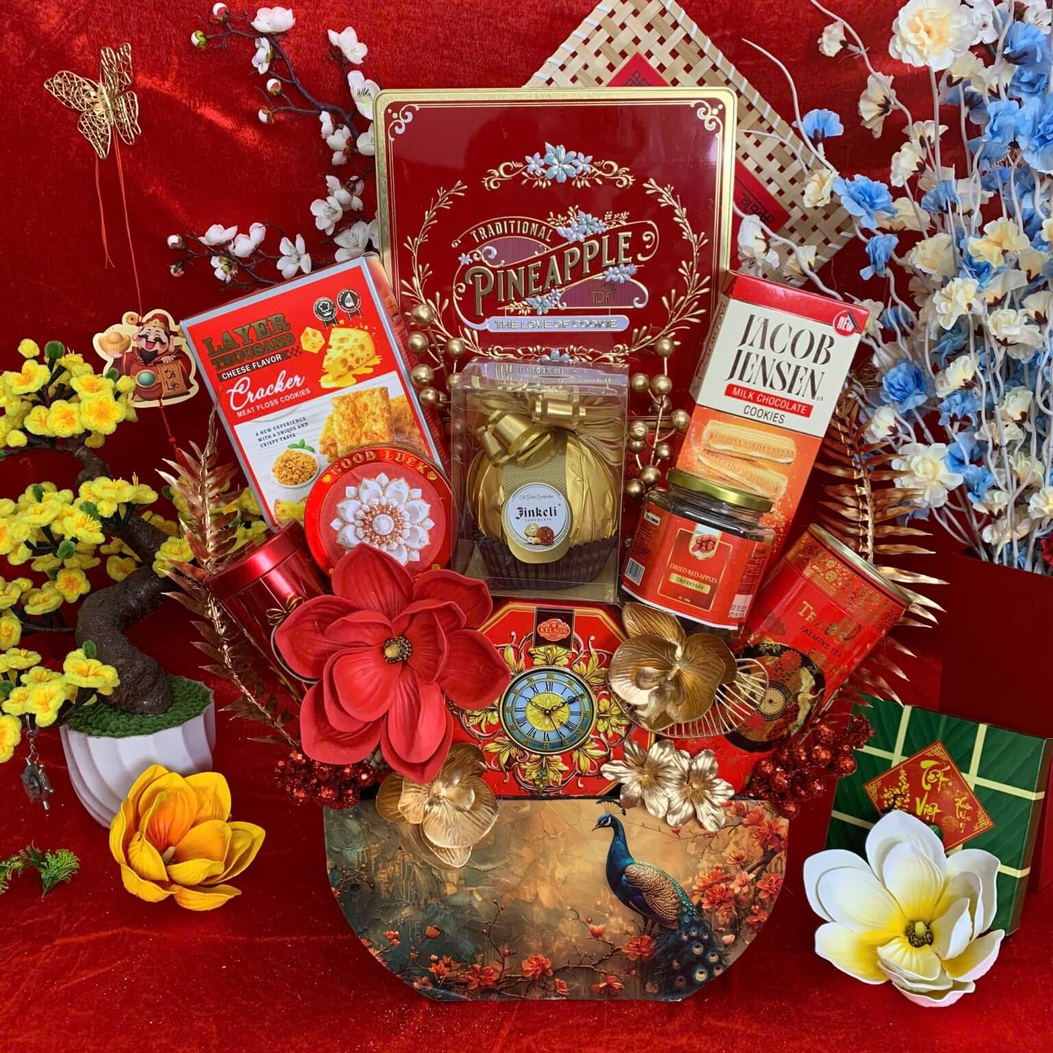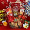 • Thiết kế sang trọng: Giỏ quà phối tông đỏ – vàng – xanh dương, tượng trưng cho may mắn, tài lộc và thịnh vượng.