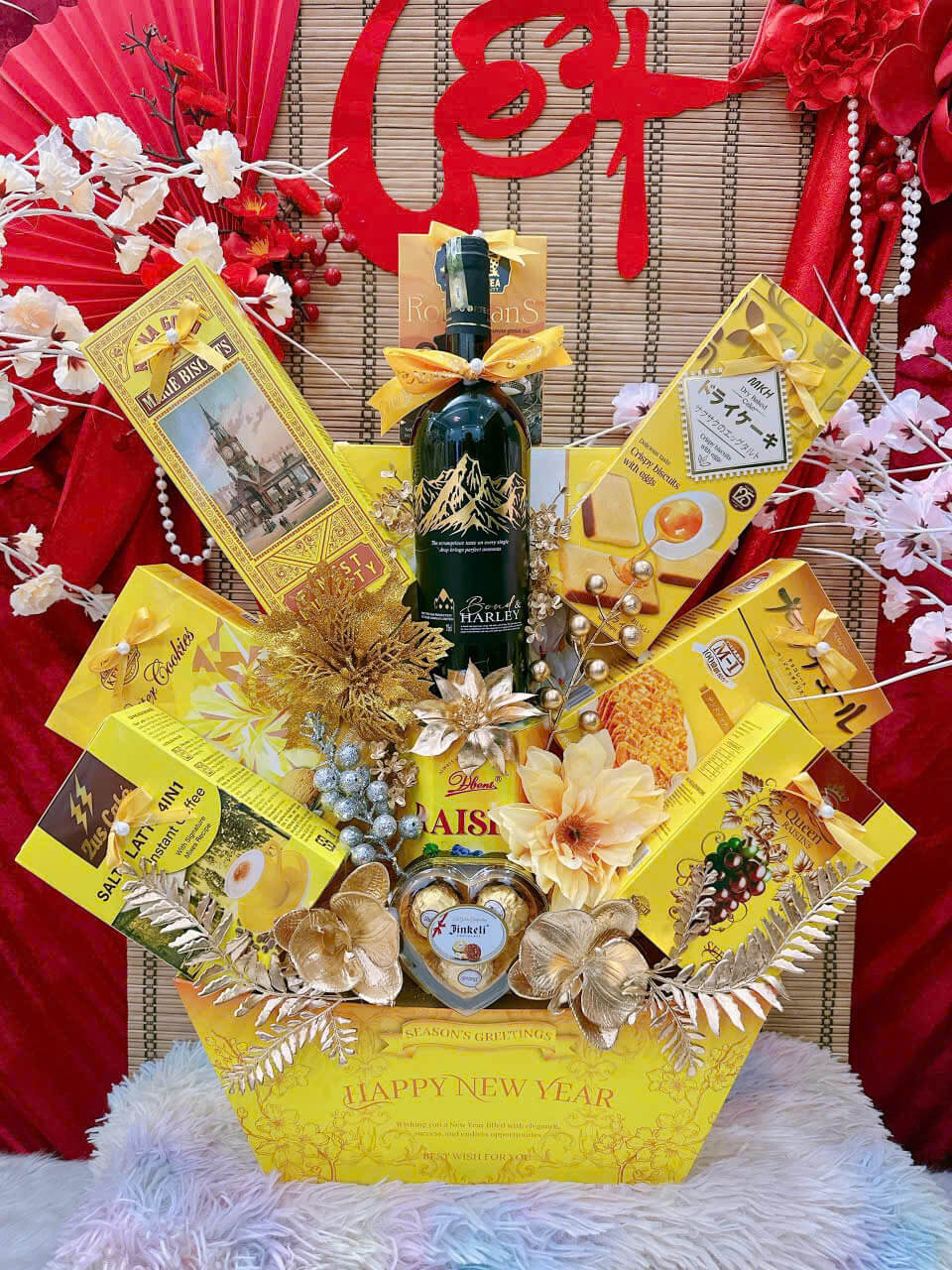 - Thiết kế sang trọng: Giỏ quà phối tông đỏ – vàng – xanh dương, tượng trưng cho may mắn, tài lộc và thịnh vượng.