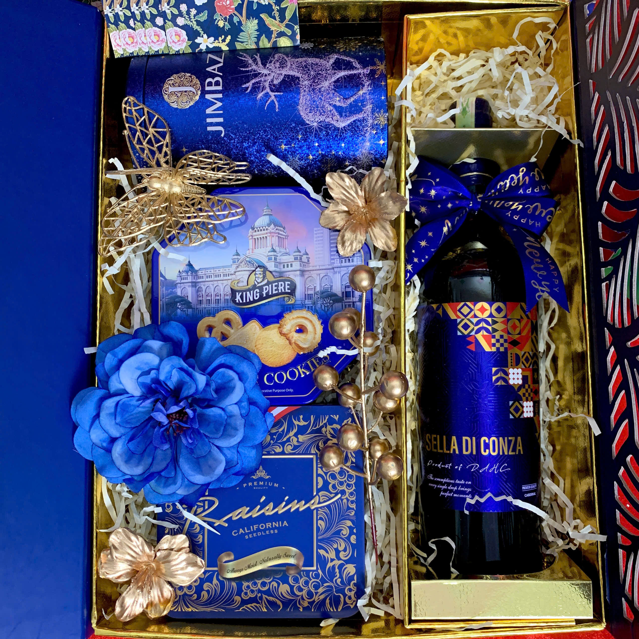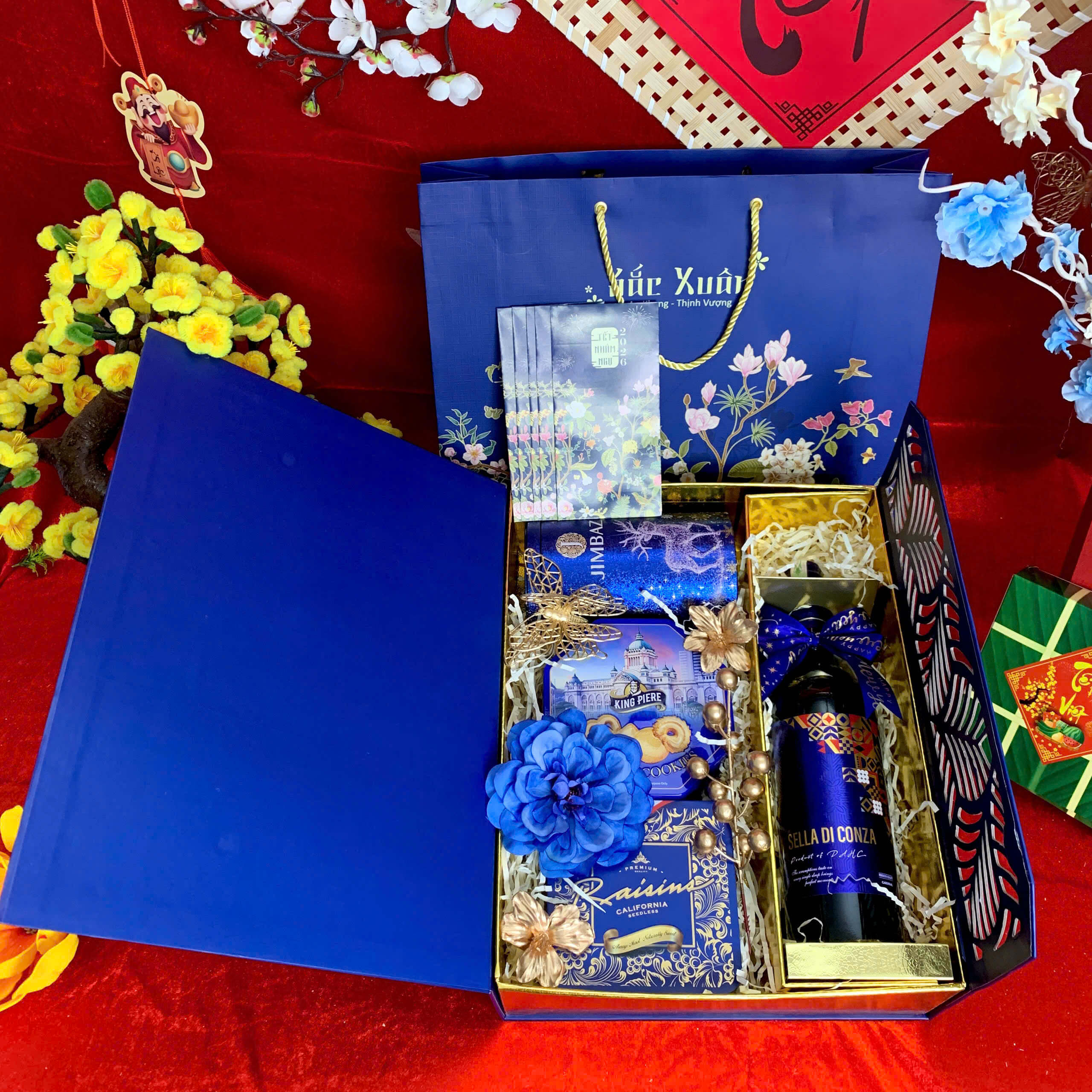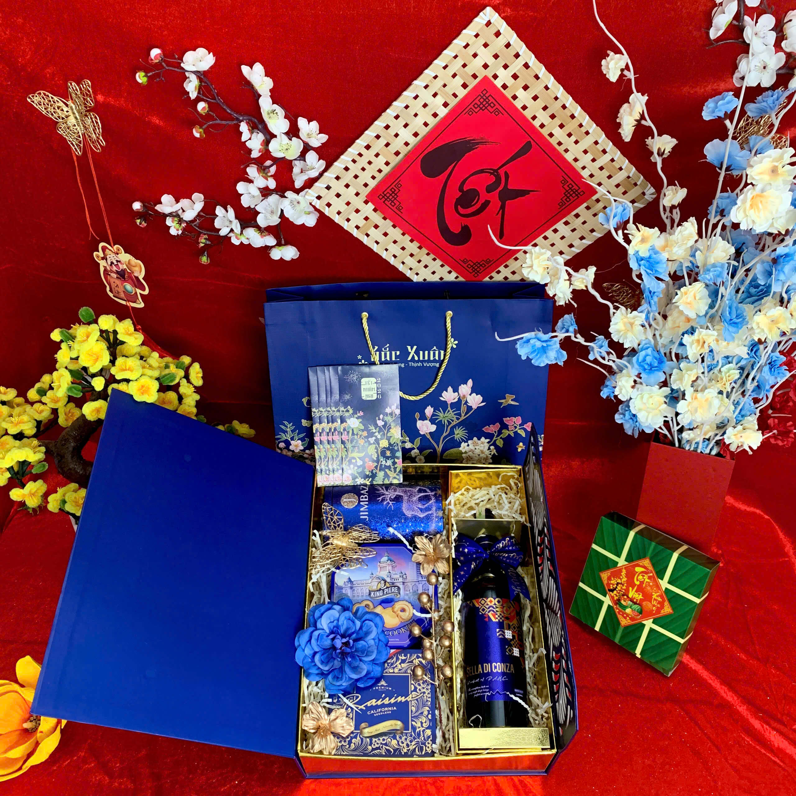- Thiết kế sang trọng: Hộp quà phối tông đỏ – vàng – xanh dương, tượng trưng cho may mắn, tài lộc và thịnh vượng.