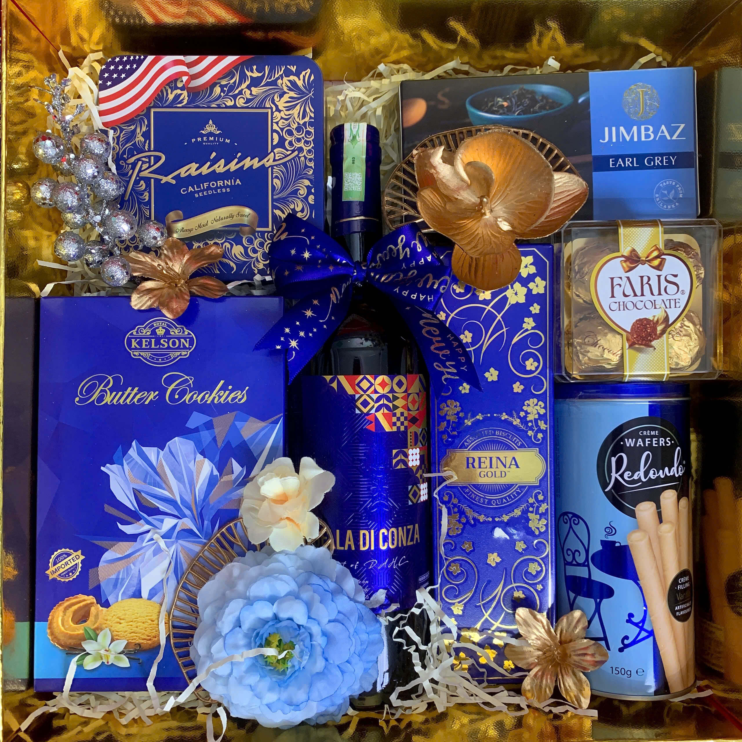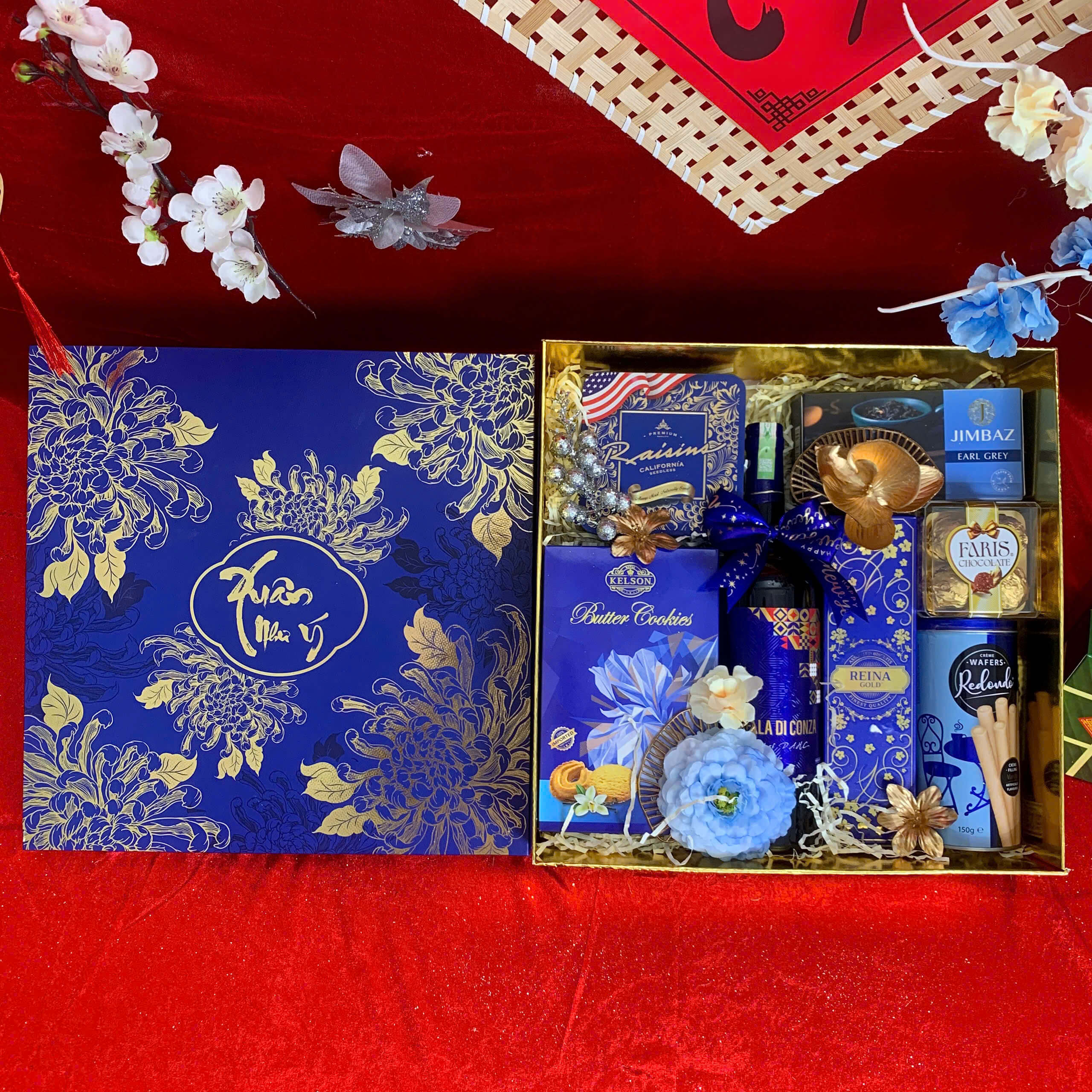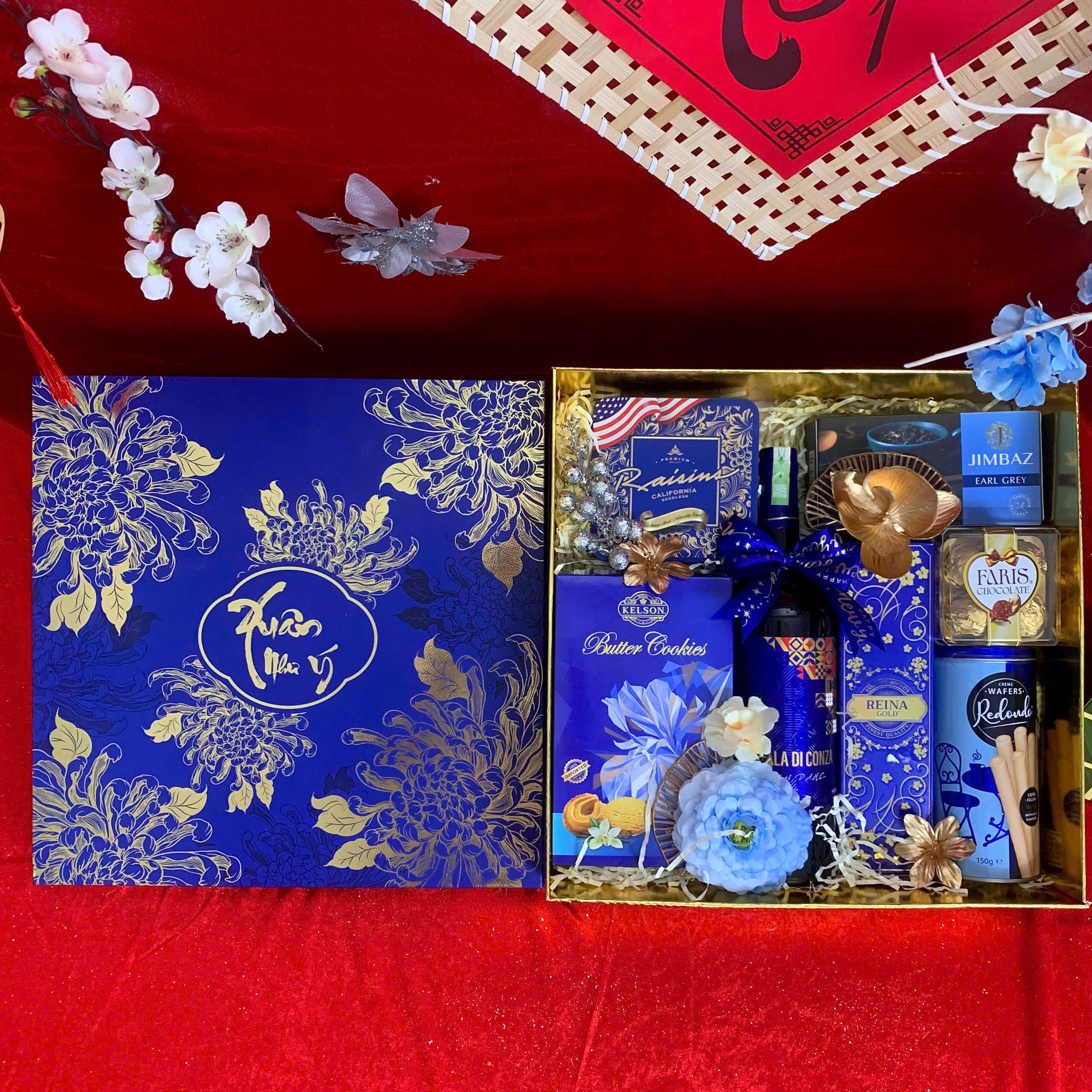 • Thiết kế sang trọng: Hộp quà phối tông đỏ – vàng – xanh dương, tượng trưng cho may mắn, tài lộc và thịnh vượng.