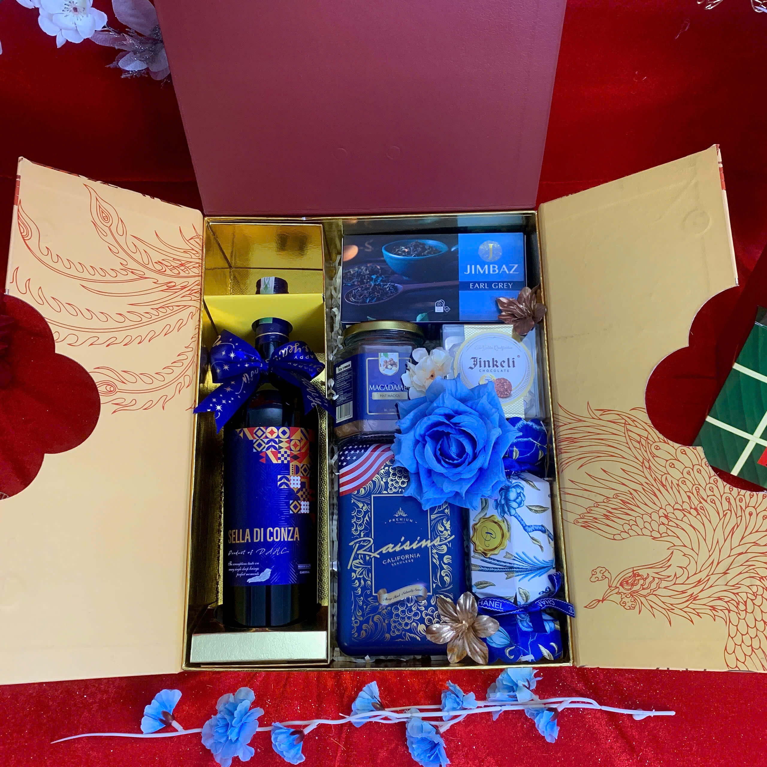 • Thiết kế sang trọng: Hộp quà phối tông đỏ – vàng – xanh dương, tượng trưng cho may mắn, tài lộc và thịnh vượng.